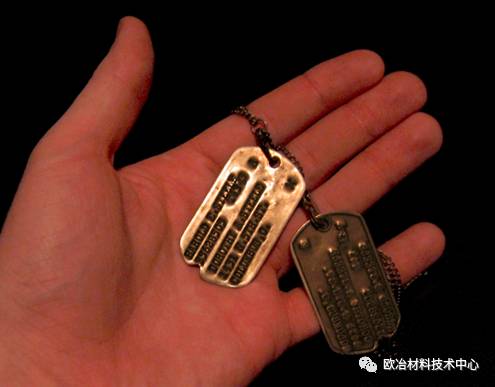 用Monel合金制作的身份牌(二戰期間美軍士兵的身份牌(Dog tags)。