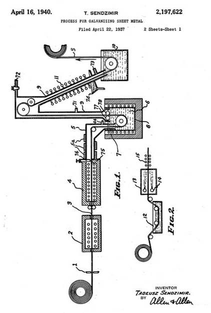 1931年,近代冶金工業最杰出的工程師波蘭人森吉米爾在波蘭建成了世界上第一條氫氣還原法連續帶鋼熱鍍鋅生產線,該法在美國獲得專利并于1936-1937年在美國和法國Maubeuge鋼鐵廠分別建成以森吉米爾名字命名的工業性熱鍍鋅生產線,開創了帶鋼連續、高速、高質量熱鍍鋅的新紀元。
