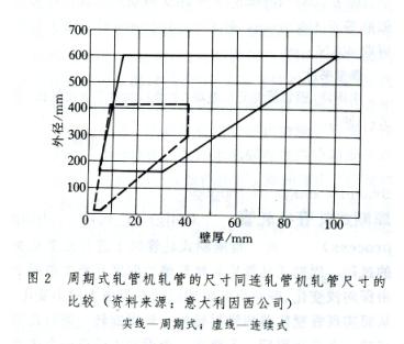 周期式軋管機軋制鋼管的直徑和壁厚較大,最大直徑可達609.6mm,壁厚可達100mm。圖2所示是周期式軋管機軋管的直徑和壁厚范圍同連續(xù)軋管機軋管的比較。