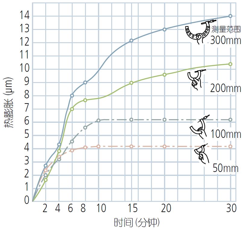如上圖所示,千分尺隨著手持時(shí)間的增長(zhǎng),熱膨脹值也隨之越大。