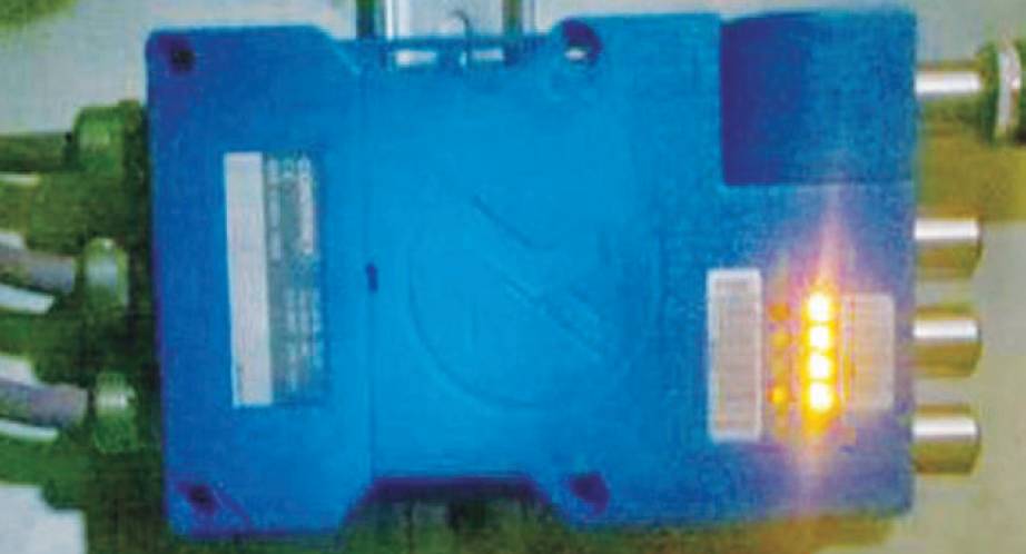 通過查詢資料得知此功能塊為附件頭識碼開關檢測,因為在該機床上安裝有識碼開關讀碼器,用以識別不同的附件頭,經總線與NCK的X102連接。檢查讀碼器時發現指示燈狀態不對,24V電源正常,PROFIBUS線正常。左側指示燈狀態:PWR、ERR、S TA、RDY、RUN和INPUT均不亮,右側HEAD1~4全亮(見圖3)。