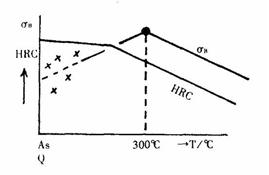 由此圖可見硬度隨回火溫度的升高而下降,但在淬火狀態(tài)以及300℃以下低溫回火時,硬度與抗拉強(qiáng)度的關(guān)系難以成立。當(dāng)回火溫度在300℃左右時,kg/m㎡與HRC具有相關(guān)關(guān)系,即硬度高,抗拉強(qiáng)度就高;硬度低,抗拉強(qiáng)度就低。在低溫回火狀態(tài)欲求出kg/m㎡值是很困難的,因為此時抗拉強(qiáng)度值分布很離散。