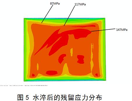 從殘留應力有限元分析結果看,如圖5所示。水淬后,薄壁深腔零部件大部分區域的殘留應力值都在100MPa以上,根部的區域甚至達到147MPa,單向應力達到該值對于2A12鋁合金來說是比較危險的。
