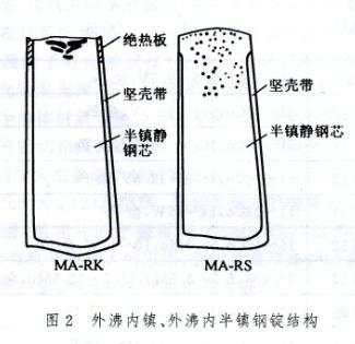 脫氧程度較鎮(zhèn)靜鋼弱,但比沸騰鋼強(qiáng)的碳素鋼。鋼水在澆注前的氧含量接近或稍高于與碳氧平衡時(shí)的氧含量。當(dāng)其凝固時(shí),一般只排出少量的氣體,在模內(nèi)進(jìn)行短時(shí)間的微弱沸騰。這種鋼錠中氣泡的體積與鋼液的冷凝收縮大致相等,為此也稱為%26ldquo;平衡鋼%26rdquo;。實(shí)際上,現(xiàn)代半鎮(zhèn)靜鋼的發(fā)展已超出其原有含義,凡切頭率比鎮(zhèn)靜鋼鋼錠低,偏析較沸騰鋼鋼錠少,介于二者之間的各種鋼錠,都可認(rèn)為是半鎮(zhèn)靜鋼,如外沸內(nèi)鎮(zhèn)鋼錠等(圖1、圖2)。