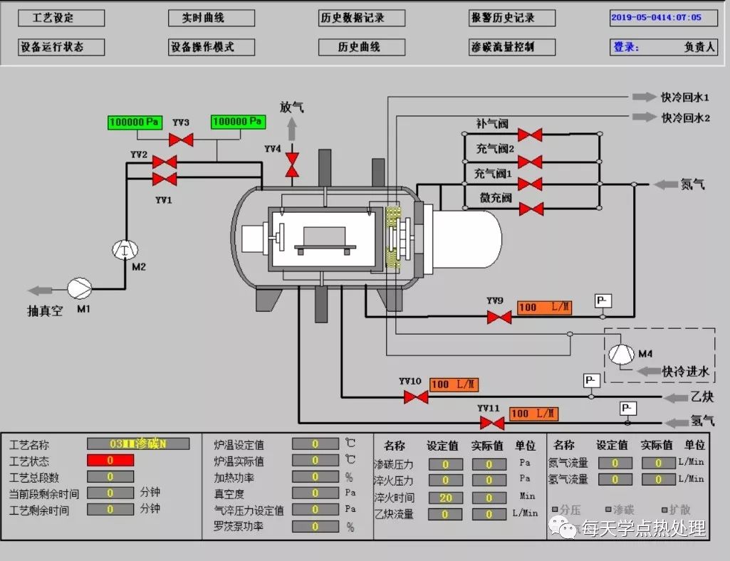 6、降溫保溫淬火工藝結束后淬火操作和普通真空設備操作方式相同。需要二次淬火的,采用降溫保溫正火,之后高溫回火,再加熱淬火。真空滲碳油淬爐,冷室具備油淬和氣冷功能。氣冷壓力2bar,冷速略大于正火。真空滲碳氣淬爐具備高壓高壓氣淬爐的所有功能。