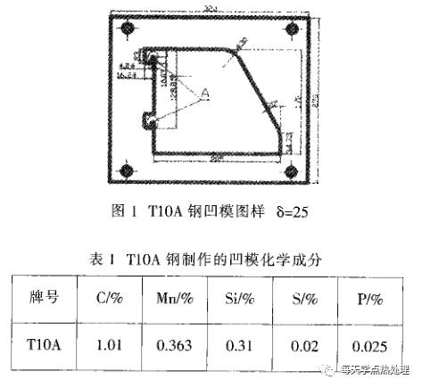 冷 作模 具是 實 現 少 無 切削 加 工 的 重要 生 產 工具,模具 壽 命 的 高低 是 衡量模 具 質量 的 重 要指 標之一,它不僅 影響 產 品 質 量,而 且 還影 響 生產 率 和 成本。本 文 提出 生 產 板插 式 組合 書 架 的凹模具,如 圖所示。采 用 T10A 鋼制 造,采用常規 熱 處 理后,測 得表面 平均硬 度 為 60.2HRC達 到 硬 度 要求。但 在 生 產過程 中 出 現 多 次沖 擊 下 早期發生疲勞斷裂,見 圖1A部位,使模具壽命大縮短! 壽命5000-6000次。針 對這 種情況,對T10A. 鋼制作的模具進行了 碳化物超細化處理工藝 的 實 踐,起到 了 提高 壽 命 的 效 果。