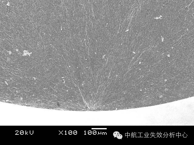 這類的源區(qū)附近斷面由于交錯分布多個解理面,因此比較粗糙,之后的疲勞擴展前、中期則會轉為平坦,最后失穩(wěn)后的快速擴展又重新變得起伏大和粗糙。此外,有些疲勞并不一定從試樣表面起源,有可能在試樣內(nèi)部,此時往往可能由于內(nèi)部存在缺陷或亞表面處于特殊應力狀態(tài)導致。