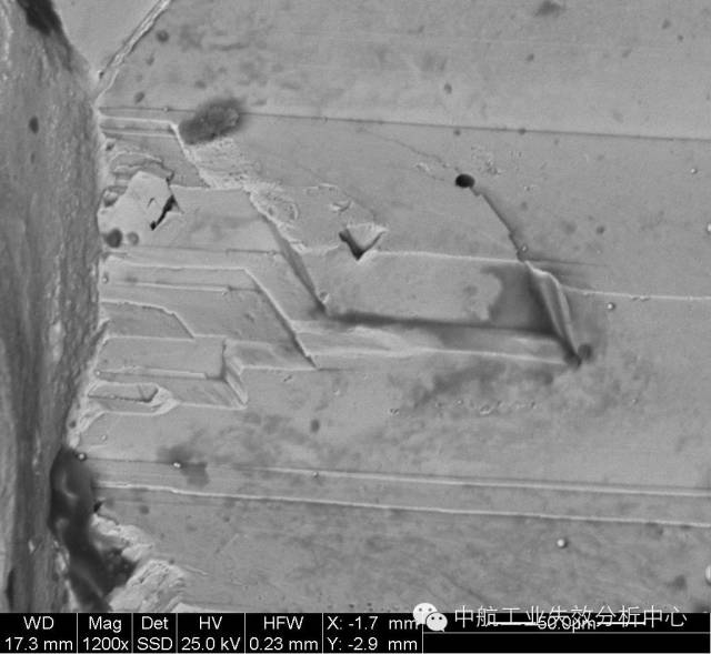 有的起源也不僅僅在一處位置起源,可能在多個位置均萌生疲勞源,這時我們就可以看到多個疲勞源之間產(chǎn)生類似臺階的特征,這是由于多處萌生裂紋并擴展過程中,不可能在一個平面上擴展,當裂紋相互交匯到一起時,必然通過剪切撕裂的方式使不同的擴展平面連接起來,從而形成臺階。