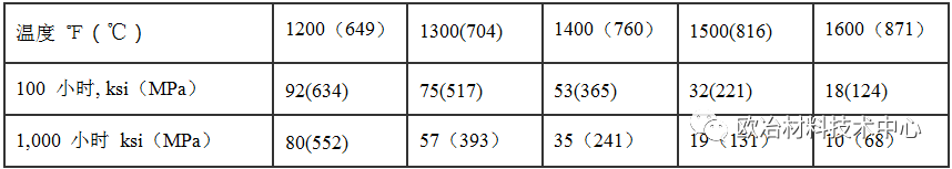 典型蠕變斷裂強度,熱處理,板- 在所列時間的斷裂應力值