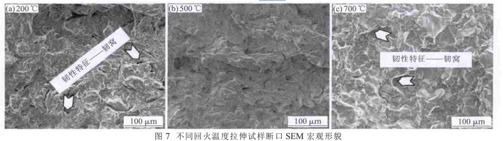 經不同回火溫度處理后試樣拉伸斷口 SEM 照片如圖 7 所示。當回火溫度為 500℃時,試樣的斷口出現了明顯的塑性變形,其斷口形貌呈韌窩狀。而回火溫度為 200和 700℃時,僅在少量微孔中發現了韌窩,絕大部分呈現出河流花樣。而事實上,200和 700℃回火溫度下的試樣均為混合斷裂,斷裂面主要表現為河流狀斷裂或是含有少量纖維狀韌性區域的脆性混合斷裂,韌窩狀主要存在于基質 / 碳化物界面。