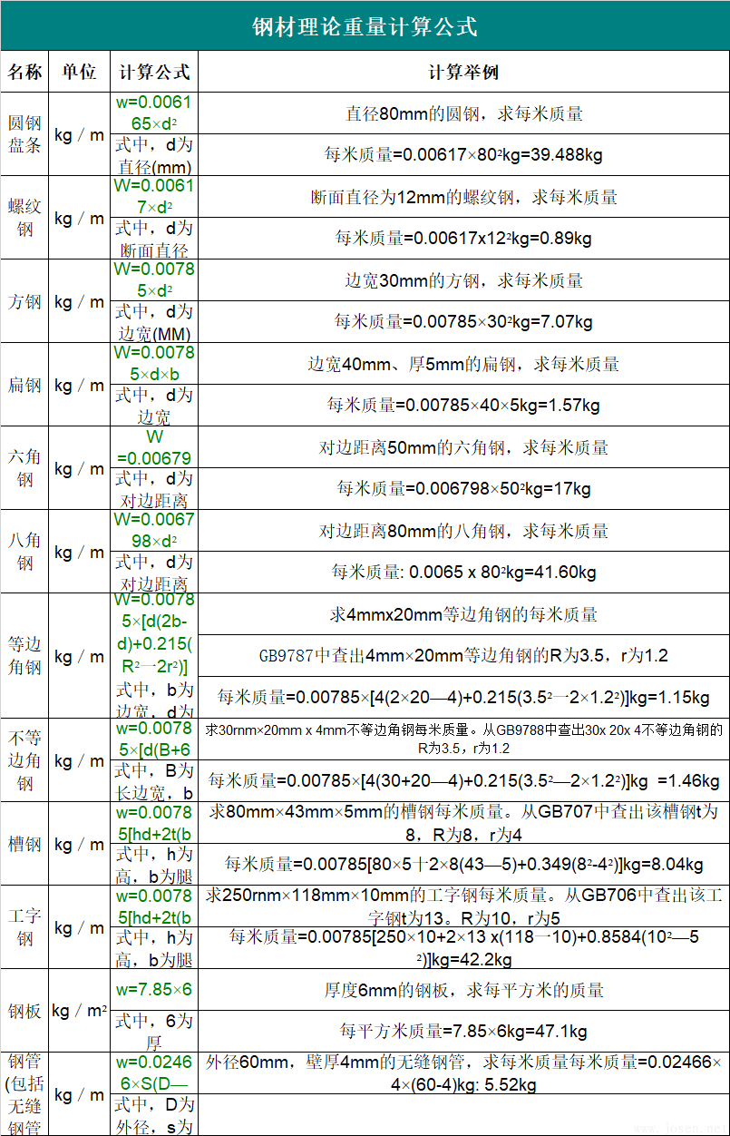 鋼材理論重量計算公式