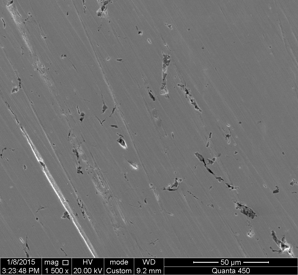 在軸上取金相樣觀察,在縱截面上發現數條長度0.5~1.3mm的夾雜物條帶,寬度在0.01~0.02mm之間,見圖3a);在橫截面上觀察到大量點狀、短片狀缺陷,見圖3b)。