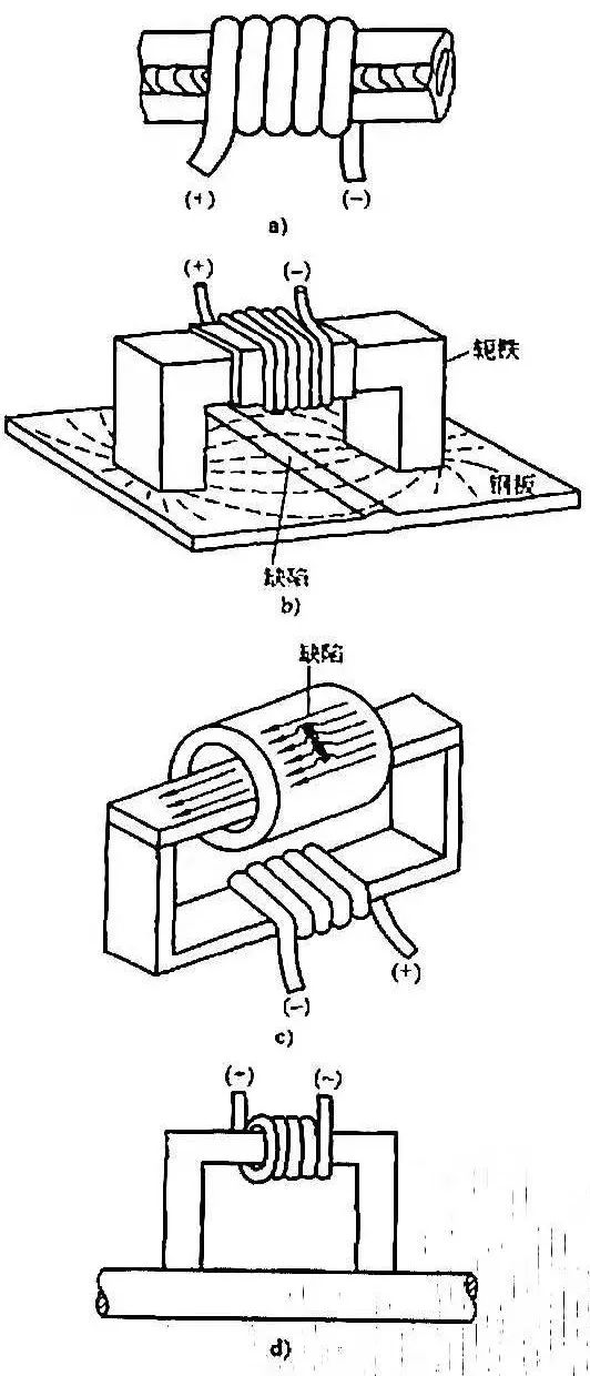 d)線圈法 e)電磁鐵法 f)磁軛法