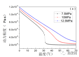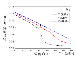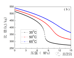 超臨界流體在準臨界點附近,一些熱物理參數(shù)隨溫度的變化非常劇烈。從圖3(a)中7.5MPa,10MPa和12.5MP三條數(shù)據(jù)線來看,壓強在臨界壓強以上,CO2隨溫度升高由液態(tài)轉(zhuǎn)變到超臨界狀態(tài)時,其比焓在準臨界點附近急劇升高,越接近7.38MPa,準臨界點附近的斜率越大,隨后緩慢升高;而從圖3(b)中的35 oC,50 oC和65 oC三條數(shù)據(jù)線來看溫度在31.1oC以上,CO2隨壓強升高由氣態(tài)轉(zhuǎn)變到超臨界狀態(tài)時,其比焓在準臨界點附近急劇降低,越接近31.1oC,準臨界點附近的斜率越大,隨后緩慢降低。