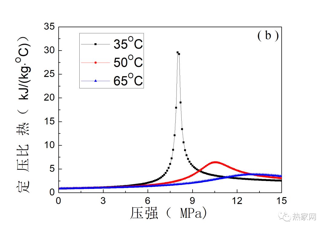 與比焓的變化規(guī)律相對應的是比熱的變化,在比焓斜率最高的地方,比熱出現(xiàn)極值,如圖4所示。據(jù)Yoon等對超臨界CO2在管內(nèi)徑為7.73mm銅管中的冷卻換熱進行的研究,在25~65oC,流速分別為241,338,464kg/m2·s, 超臨界CO2冷卻時的換熱系數(shù)在2.0~15.0kW/(m2·K)范圍內(nèi),且發(fā)現(xiàn)CO2換熱系數(shù)的變化趨勢與比熱的變化趨勢非常相似,認為這主要是由于比熱在準臨界溫度附近變化比較劇烈,并在準臨界溫度下達到最大值的緣故。