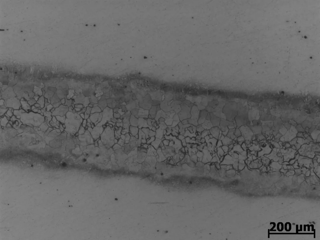 可以看出,基體主要成分為Fe(84.27%)、Cr(13.70%)、Si等元素,主要成分符合Cr13型不銹鋼要求。條帶區域主要成分為Fe(97.05%)、Cr(1.29%)、Si等元素,但Fe、Cr元素明顯區別于基體成分。
