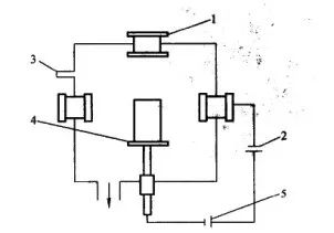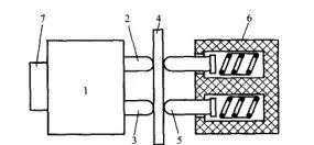 圖7是這種儀器的原理示意圖,主要是利用兩個熱電對2和3,一個是被加熱的電極,另一個是冷的電極,兩個電極之間由于溫差產生熱電勢,并且這個電勢隨鋼箔表面的含碳量不同而有規律地變化。