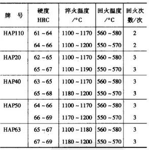 各國粉末高速鋼根據牌號不同,其熱處理規范也不同。瑞典的四種牌號粉末高速鋼的淬火溫度均設為1160℃~1180℃。美國粉末高速鋼CPM Rex42的淬火溫度采用1230℃,CPM Rex20采用1190℃。奧地利的粉末高速鋼S390PM淬火溫度采用1150℃~1240℃。日本的幾種牌號高速鋼的熱處理規范見表8 。