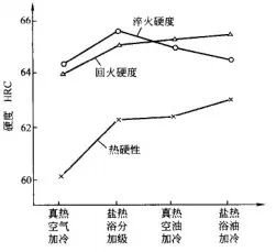 高速鋼工具在真空爐加熱淬火,現在大都采用高純氮氣冷卻(純度99.999%)。采用氮氣冷卻隨著使用壓力的加大,冷卻能力也增加。采用常壓氣體冷卻時,冷卻速度很小,只適用于很小尺寸或對硬度要求不高的零件。常壓氣淬工具畸變小,有碳化物自基體中析出,因此硬度和熱硬性顯著下降。圖9表示出了冷卻方式對高速鋼熱硬性的影響。