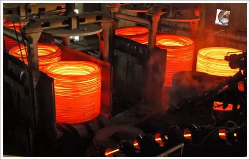火紅的成品會在這里被工人們進行質量初檢,然后到達吐絲機吐絲,成品線材在這里被盤成圓卷,冷卻后打包。