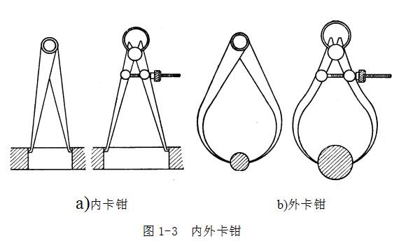 圖1-3是常見的兩種內外卡鉗。內外卡鉗是最簡單的比較量具。外卡鉗是用來測量外徑和平面的,內卡鉗是用來測量內徑和凹槽的。它們本身都不能直接讀出測量結果,而是把測量得的長尺寸 (直徑也屬于長度尺寸),在鋼直尺上進行讀數(shù),或在鋼直尺上先取下所需尺寸,再去檢驗零件的直徑是否符合。