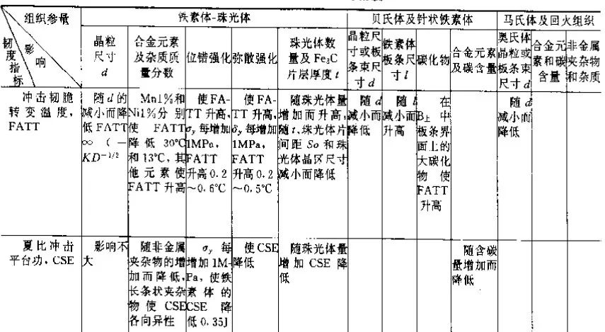 鋼中的組織參量對(duì)材料韌度有不同影響。表1 為鋼的組織參量與韌度的關(guān)系。