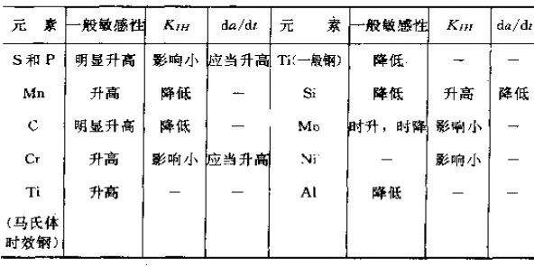 合金元素對(duì)氫脆敏感性的影響與氫脆性質(zhì)和鋼種有關(guān)。例如,高強(qiáng)度鋼對(duì)內(nèi)部氫脆和環(huán)境氫脆都很敏感;而低強(qiáng)度鋼、奧氏體鋼和鎳基合金對(duì)內(nèi)部氫脆不敏感;而其環(huán)境氫脆傾向性卻比較大。Mn顯著增大了鐵素體與馬氏體鋼的氫脆傾向,而對(duì)奧氏體鋼的氫脆影響相對(duì)較小。研究表明,C、P、S、Si增大了鋼的氫脆傾向。鋼中某些稀土元素(如Pd、Ta、La、Sc)和碳化物形成元素(Ti、V、Al、Nb、Zr等)能夠增加氫陷阱的數(shù)量,降低陷阱中富集的氫含量;加Ca或稀土元素能夠改變MnS夾雜的形狀,使其變圓變細(xì),因而能夠增加氫陷阱中的臨界氫濃度;Cu、Al等元素能夠在金屬表面形成沉淀或氧化膜,阻礙環(huán)境中親情的進(jìn)入。Cu、Al、Ti 和稀土元素通過(guò)上述機(jī)制減小了鋼對(duì)氫脆的敏感性。合金元素對(duì)鋼的氫致裂紋擴(kuò)展行為的影響如表2 所示。