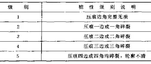 滲氮層脆性常用維氏硬度法檢查評(píng)定,GB11354-xxxx《鋼鐵零件滲氮層深度測(cè)定和金相組織檢驗(yàn)》中規(guī)定,根據(jù)維氏硬度壓痕邊角破碎程度,滲層現(xiàn)在分為5級(jí),如表 3 所示。