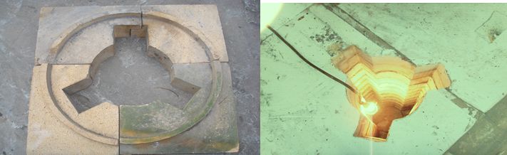 (1)爐膛型磚由于考慮到砌爐工人的勞動強(qiáng)度大的因素,原來結(jié)構(gòu)采用的是組合式結(jié)構(gòu),強(qiáng)度較差,有以下弊病:縫隙較多,易滲鹽;拉刀爐實際使用中熱脹冷縮時,型磚容易從組合相接處開裂。原組合好的型磚如圖2所示。