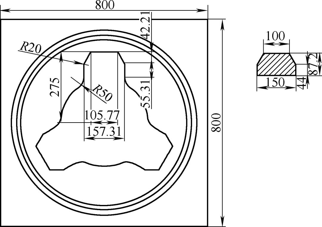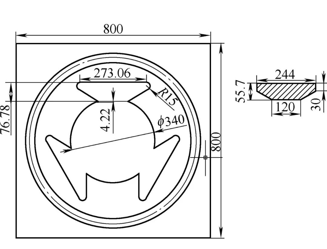 (3)原電極的長方形截面抗變形強(qiáng)度低,主電極在熱處理的過程中易變形,圖3所示為組合后的型磚結(jié)構(gòu),圖3剖線部分為電極截面形狀。