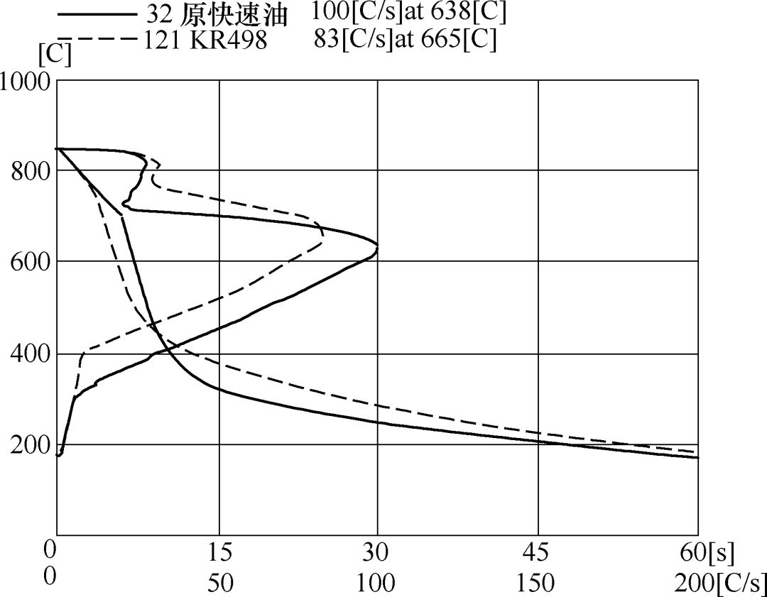 按照ISO/DIS 9950標準規定的方法檢測了原快速淬火油和KR498的冷卻特性,原快速淬火油與KR498淬火油冷卻特性曲線如圖3所示,從圖3中可以看出科潤公司的等溫分級淬火油KR498特性溫度更高,蒸汽膜階段短,低溫冷速更慢,使得工件在淬火冷卻過程中破膜能力更強,低溫組織轉變應力更小,在保證淬透性的前提下,能夠有效地降低工件的變形量。