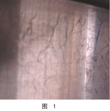 我公司生產的QT800-5某型號四缸曲軸,經軸頸感應淬火+回火+精磨后,在光滑的軸頸表面上產生了微裂紋,有的呈帶狀分布,深度較淺,且基本一致,形態上辨別為龜裂或網狀,如圖1所示,也有單條直線裂紋(或多條平行的點條裂紋),如圖2所示。磨削裂紋的產生嚴重影響了曲軸的使用性能,導致曲軸斷裂破壞,只能報廢處理,給公司經營造成了一定的損失。