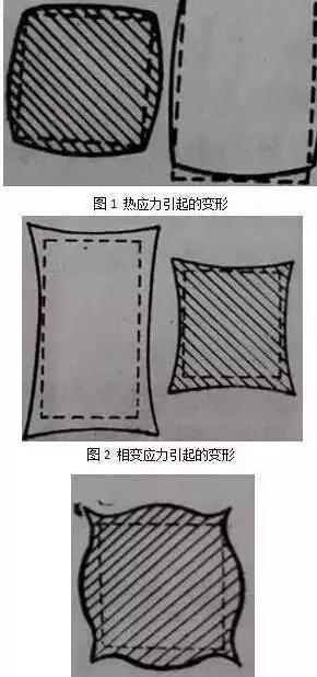 2.由熱應力所引起的變形是鋼料趨于球形化(見圖1),而由相變應力所引起的變形則使之趨于繞線軸狀(見圖2)。因此淬火冷卻所致的變形表現為兩者的結合(圖3),按照淬火方式的不同,表現出不同的變形如圖4所示。