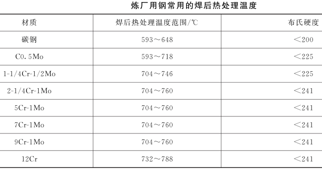 碳鋼和低合金鋼焊后去應(yīng)力退火溫度不低于 620℃ ,并按照 1h / 25mm (厚度)計(jì)算保溫時(shí)間。下表是煉廠用鋼常用的焊后熱處理溫度范圍,硬度值可以作為熱處理效果的判據(jù)。
