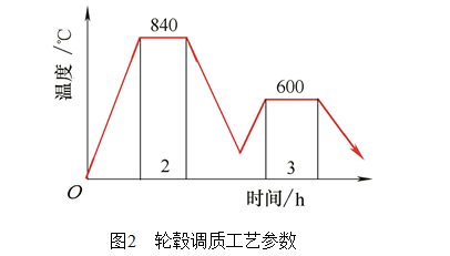 該輪轂調質淬火工藝參數為:840℃加熱淬火,保溫2h,回火溫度600℃,淬火油溫度控制在25~50℃,淬火時開動攪拌泵對淬火油進行攪拌,以保證淬火效果,輪轂工藝參數如圖2所示。我公司常年使用該工藝參數對輪轂進行調質處理,產品質量穩定,硬度、金相組織等均合格,并且從未出現任何調質淬火裂紋現象。2014年生產3批淬火輪轂,探傷突然發現大批量淬火裂紋現象(裂紋統計情況見表2),嚴重影響生產進度,造成巨大經濟損失。