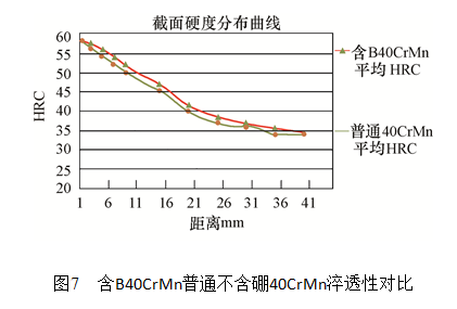 通過上述分析,可初步判定原材料中B元素添加是造成輪轂淬火裂紋的直接原因,為進一步驗證我們的判斷,我們對不含B的普通40CrMn鋼和含B量為0.0006%的40CrMn鋼分別制取端淬試樣,兩種試樣化學成分如表4。對兩種試樣880℃的淬透性進行對比,對比結果如圖7所示,從圖7可以看出在其他化學成分基本相當的情況下,含B的40CrMn淬透性明顯高于不含B的40CrMn。