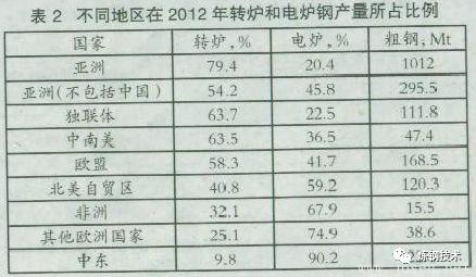 雖然電弧爐煉鋼產(chǎn)量沒(méi)有超過(guò)全球粗鋼總產(chǎn)量的三分之一(在2012年占29.3%),但由于中國(guó)在世界鋼產(chǎn)量的主導(dǎo)地位(占世界總量的46%),且它主要使用氧氣煉鋼,電弧爐煉鋼的影響被忽略,表2顯示了在2012年不同地區(qū)轉(zhuǎn)爐煉鋼及電弧爐煉鋼的相對(duì)比例。