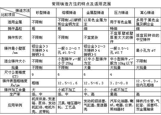 鑄造方法很多,應根據(jù)鑄件的結(jié)構(gòu)特點、形狀、尺寸大小、合金種類、技術(shù)要求及設備等具體條件進行全面分析比較,合理選擇,才能達到優(yōu)質(zhì)、高產(chǎn)、低成本的目的。常見鑄造方法的特點及適用范圍見下表。