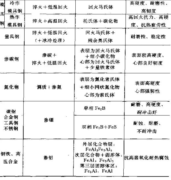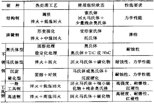 ▼表1 常用鋼種熱處理工藝、組織及性能