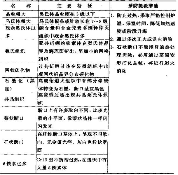 各種過(guò)熱組織的特征和預(yù)防措施建表9 。為了防止產(chǎn)生過(guò)熱,應(yīng)正確的制定并實(shí)施合理的熱處理工藝,嚴(yán)格控制爐溫和保溫時(shí)間一般過(guò)熱組織可以通過(guò)多次退火或正火消除,對(duì)于較嚴(yán)重的過(guò)熱組織,如石狀斷口,不能用熱處理消除,必須采用高溫形變和退火聯(lián)合作用才能消除。
