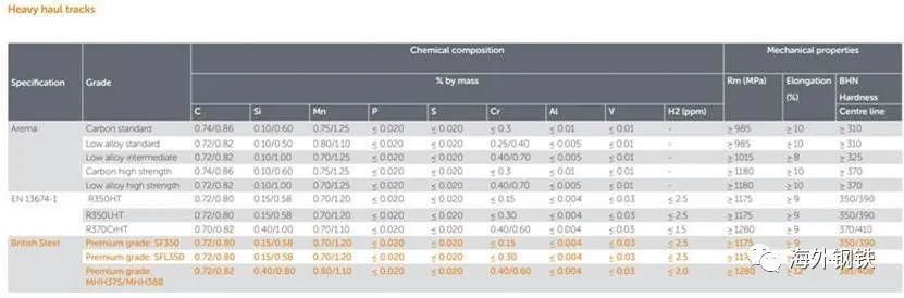 (3)MHH(MaximumHeadHardness)系列。有卓越的耐磨性,法國HAYANGE生產。MHH等級,如MHH375和MHH38。MHH系列是熱處理范圍內最耐磨的鋼軌。由最好的珠光體微觀結構組成,具有優異的耐磨性和抗滾動接觸疲勞性能,塑性變形良好,同時具有世界一流的低殘余應力(<50MPa),符合CEN(歐洲標準化委員會)、AREMA(美國鐵路工程與道路維護協會)和其他規范。用于緊密彎曲和重載軌道,減少鋼軌退化和底部疲勞,延長鋼軌壽命。