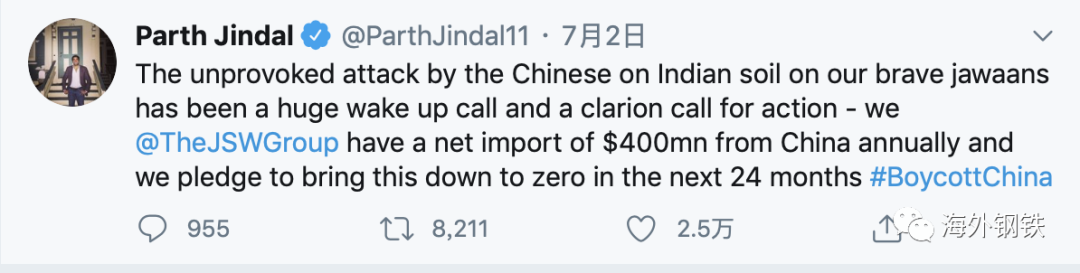 印度鋼鐵巨頭JSW Group的董事總經(jīng)理Parth Jindal在7月2日發(fā)布推文稱,JSW將在未來(lái)兩年內(nèi)將價(jià)值4億美元的中國(guó)進(jìn)口額減少至零。ParthJindal11發(fā)推文:“中國(guó)對(duì)印度勇敢的無(wú)端攻擊(注:歪曲事實(shí))是一個(gè)巨大的警鐘,并號(hào)召采取行動(dòng)-我們@TheJSWGroup每年從中國(guó)凈進(jìn)口4億美元,我們保證將這一目標(biāo)在接下來(lái)的24個(gè)月內(nèi)降為零”