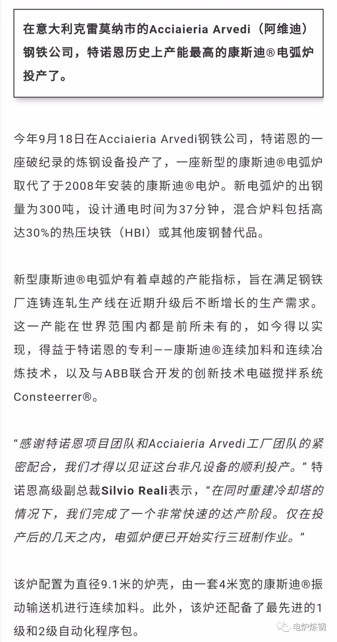 特諾恩歷史上產能最高的康斯迪?電弧爐在Arvedi鋼鐵投產!