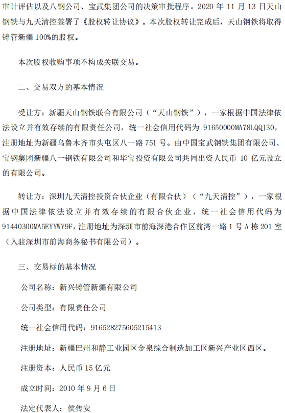 11月13日晚間,八一鋼鐵發布公告稱,該公司控股股東寶鋼集團新疆八一鋼鐵有限公司的控股子公司新疆天山鋼鐵聯合有限公司受讓深圳九天清控投資合伙企業持有的新興鑄管新疆有限公司100%股權。11月13日,天山鋼鐵與九天清控簽署了《股權轉讓協議》。本次股權轉讓以2019年12月31日為基準日,以公司經天健會計師事務所審計、北京中企華資產評估有限責任公司評估后的100%股權價值為基礎,各方協商確定本次股權轉讓價款為21.81億元。