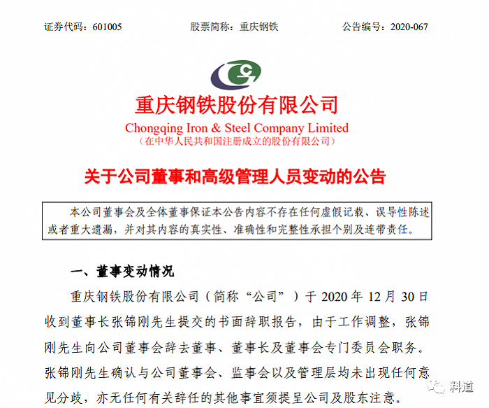 12月31日,重慶鋼鐵發(fā)布了《關(guān)于公司董事和高級管理人員變動的公告》,稱公司原董事長張錦剛提交辭呈(張錦鋼辭職后赴任新組建的中南鋼鐵董事長),公司總經(jīng)理劉建榮、副總經(jīng)理呂峰、張理全、曾兢也全部提交了書面辭職報告。