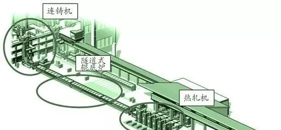 在大河鋼鐵廠建設(shè)一期階段,CSP生產(chǎn)線包括一臺(tái)CSP薄板坯連鑄機(jī)、一座隧道式輥底爐、一座6機(jī)架熱軋機(jī)和一臺(tái)地下卷取機(jī),如圖所示。CSP生產(chǎn)線整體采用西馬克X-Pact電氣自動(dòng)化控制系統(tǒng),來配置過程模型二級(jí)及一級(jí)系統(tǒng)。