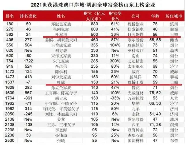 3月2日,胡潤研究院發(fā)布《2021胡潤全球富豪榜》,全球新增412位十億美金企業(yè)家,總數(shù)達到3228人,創(chuàng)歷史新高。中國以1058位十億美金企業(yè)家領(lǐng)先于美國,增加259位。中鋼網(wǎng)梳理發(fā)現(xiàn),山東省有32位企業(yè)家上榜,日照地區(qū)有2位企業(yè)家上榜,其中,日照鋼鐵的杜雙華以500億元財富奪得山東上榜企業(yè)家第三位,嵐橋工貿(mào)的葉成以150億元財富位居山東上榜企業(yè)家第十二位。