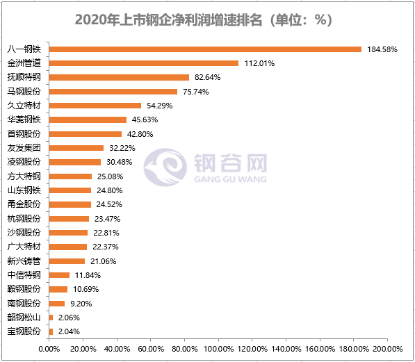 據(jù)鋼谷網(wǎng)統(tǒng)計(jì),目前公布的36家上市鋼企,其中21家盈利增速均為正值,僅有15家鋼企盈利增速出現(xiàn)下滑。從排名來(lái)看,去年增長(zhǎng)最快的是八一鋼鐵,增幅高達(dá)184.58%,第二名金州管道的增幅也超過(guò)了100%。其中,增幅處于30%—100%之間的有7家鋼企,增幅處于10%—30%之間的有9家鋼企。值得注意的是,在營(yíng)收與凈利方面表現(xiàn)卓越的寶鋼股份,在凈利增速上,卻差強(qiáng)人意,排名墊底。