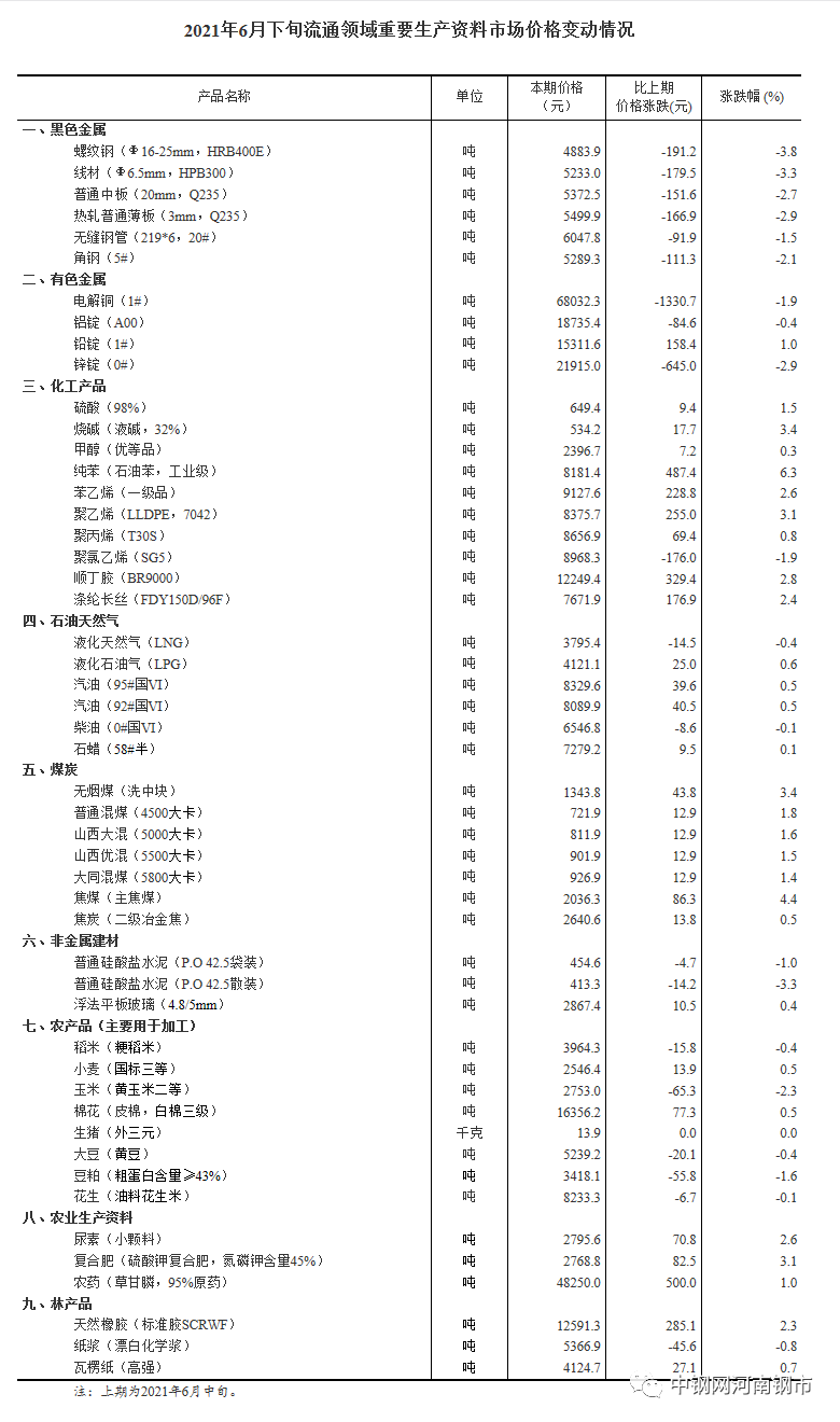 據國家統計局官網消息,據對全國流通領域9大類50種重要生產資料市場價格的監測顯示,2021年6月下旬與6月中旬相比,29種產品價格上漲,20種下降,1種持平。