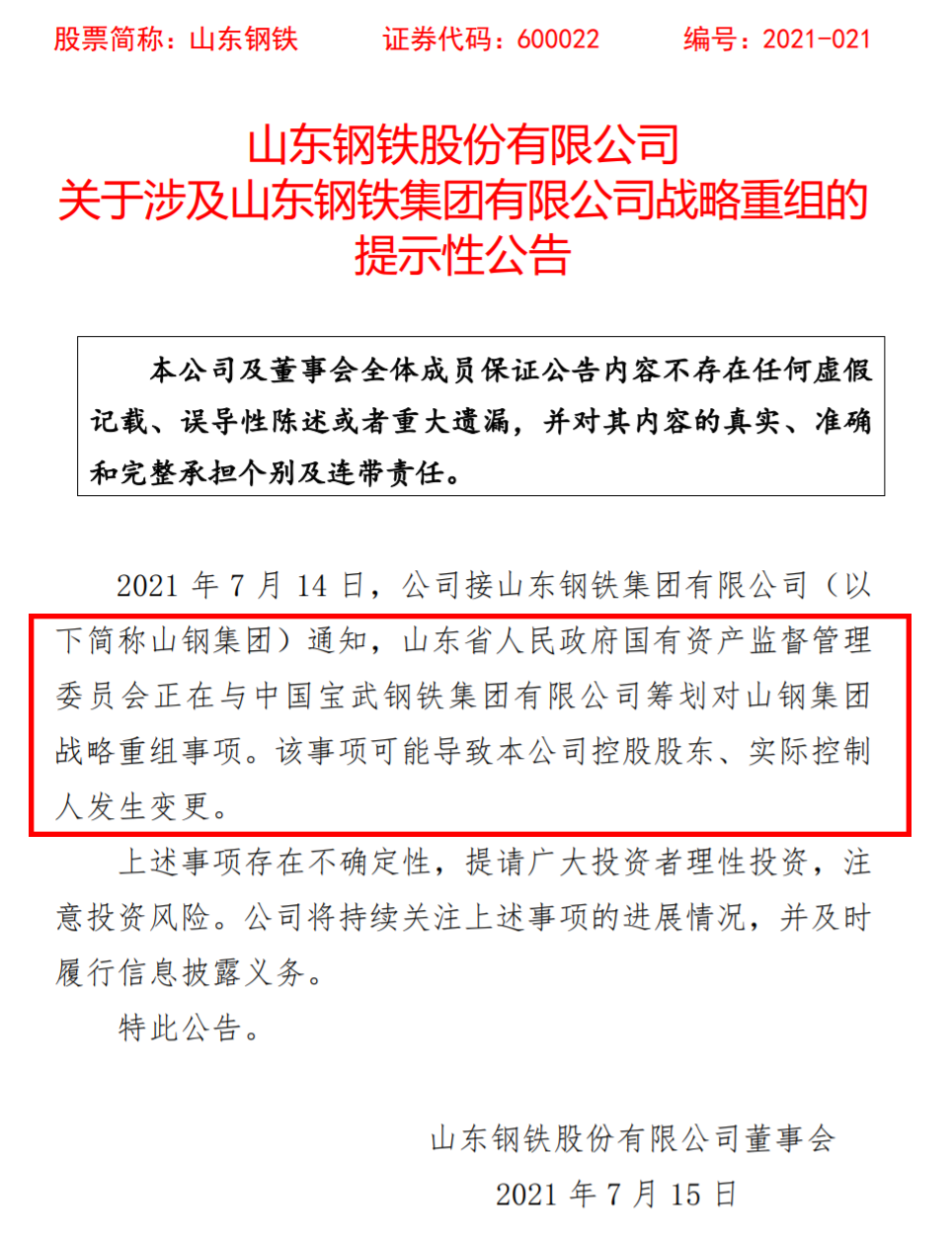 寶武兼并重組山鋼!提高鐵礦石話語權(quán) , 7月14日晚間,山東鋼鐵(600022,SH)發(fā)布公告稱,公司接山鋼集團(tuán)通知,山東省國資委正在與中國寶武集團(tuán)籌劃對山鋼集團(tuán)戰(zhàn)略重組事項(xiàng)。該事項(xiàng)可能導(dǎo)致本公司控股股東、實(shí)際控制人發(fā)生變更。